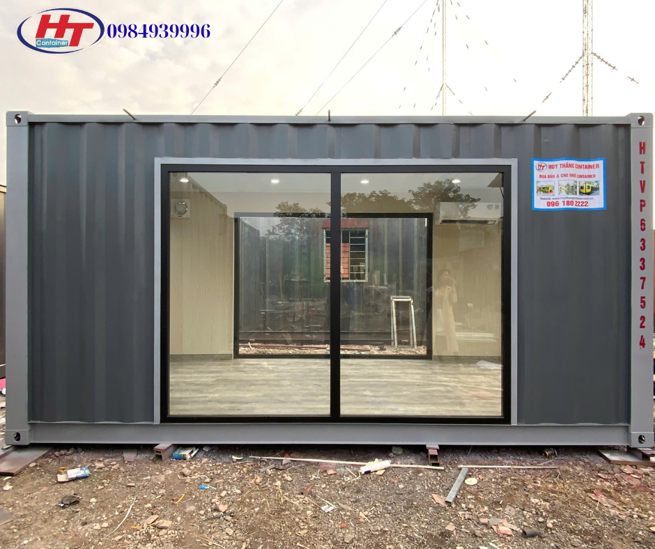 Container sử dụng cửa kính nhôm hệ giúp lấy sáng tự nhiên tối đa, tạo cảm giác không gian rộng và thoáng hơn so với container văn phòng truyền thống. Bên ngoài sơn màu xám đặc trưng, vừa sạch sẽ vừa phù hợp với nhiều môi trường công trình và khu dân cư.
