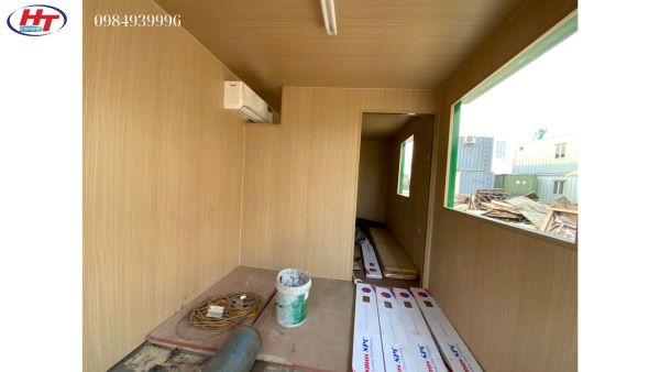 Container được chia thành ba phòng: hai phòng ngủ và một phòng khách. Các cửa sổ và cửa đi được bo khung chắc chắn theo yêu cầu, giúp tăng tính thẩm mỹ và an toàn. Không gian ở giữa là phòng khách dài 6m và rộng 2,44m, 2 bên dựng 2 vách ngăn phòng ngủ mỗi phòng dài 3m và rộng 2,44m.